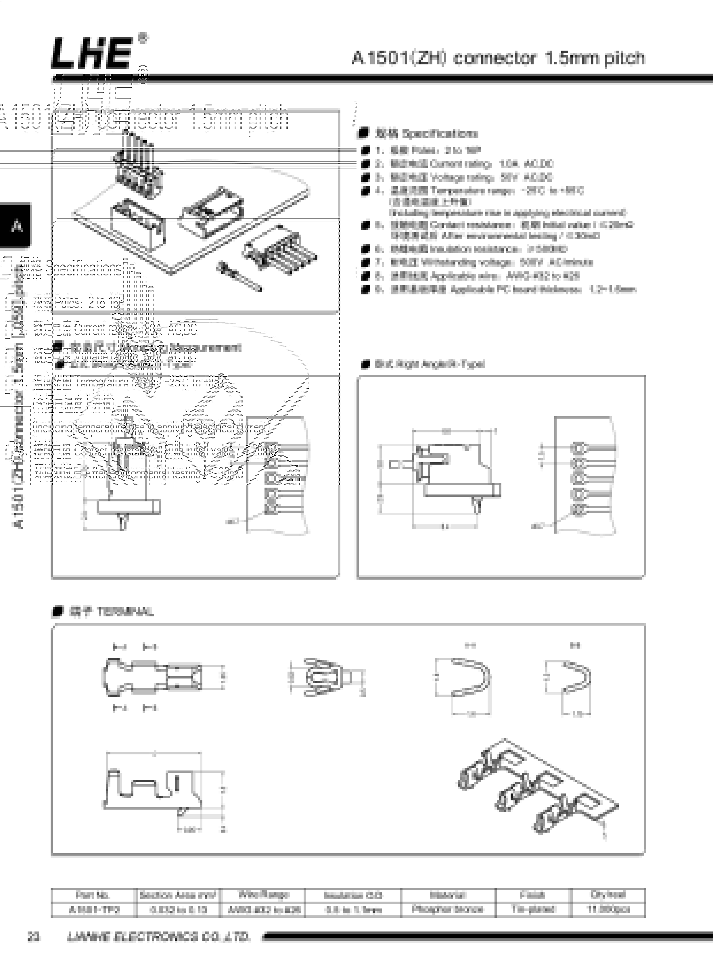 A1501(ZH)系列間距 1.5mm, 可替代JST-ZHR 系列,包含膠殼 連接器 針座 端子,產品技術成熟,性能穩定,產品通用性強,大規模使用于白色家電。