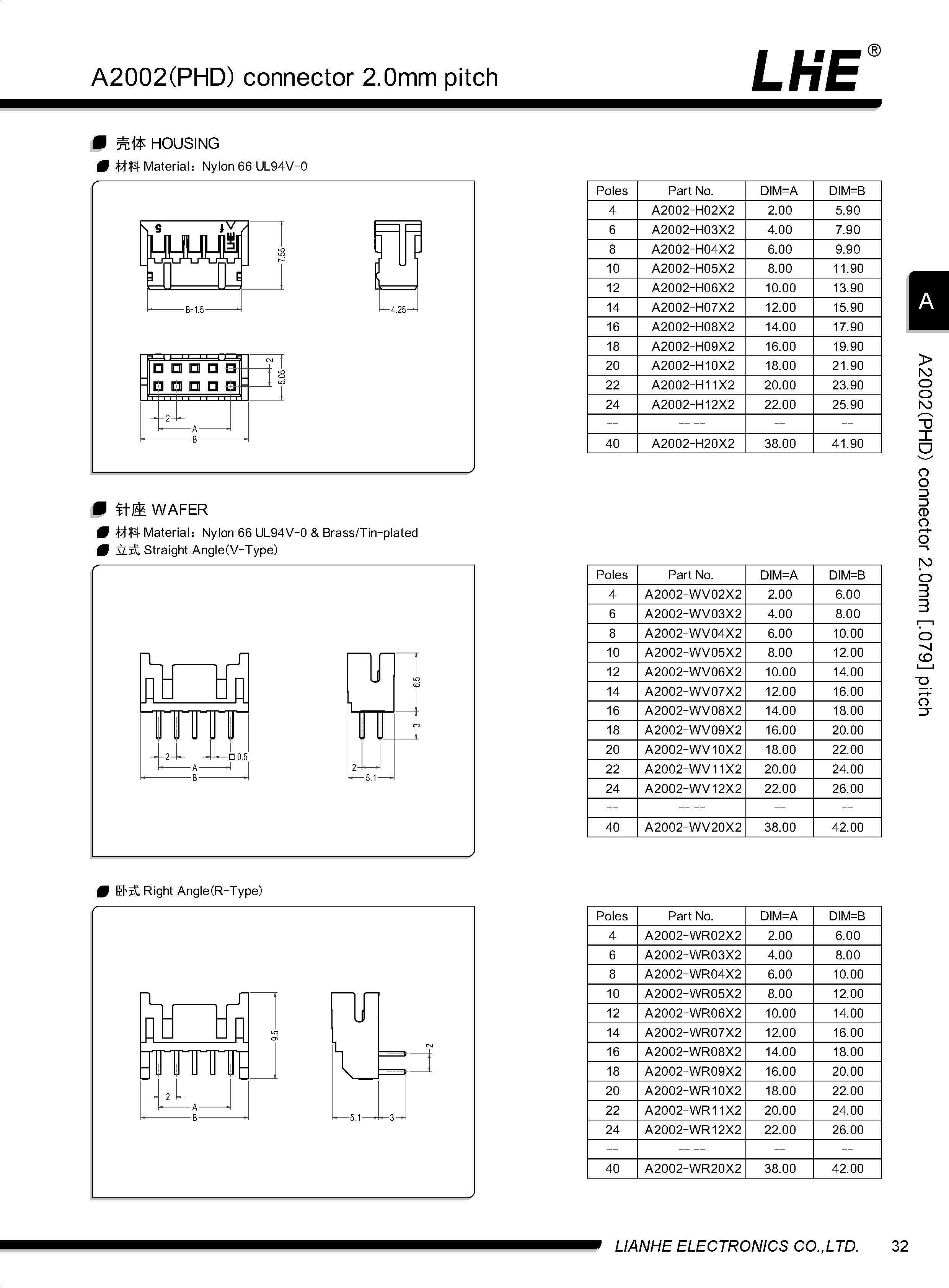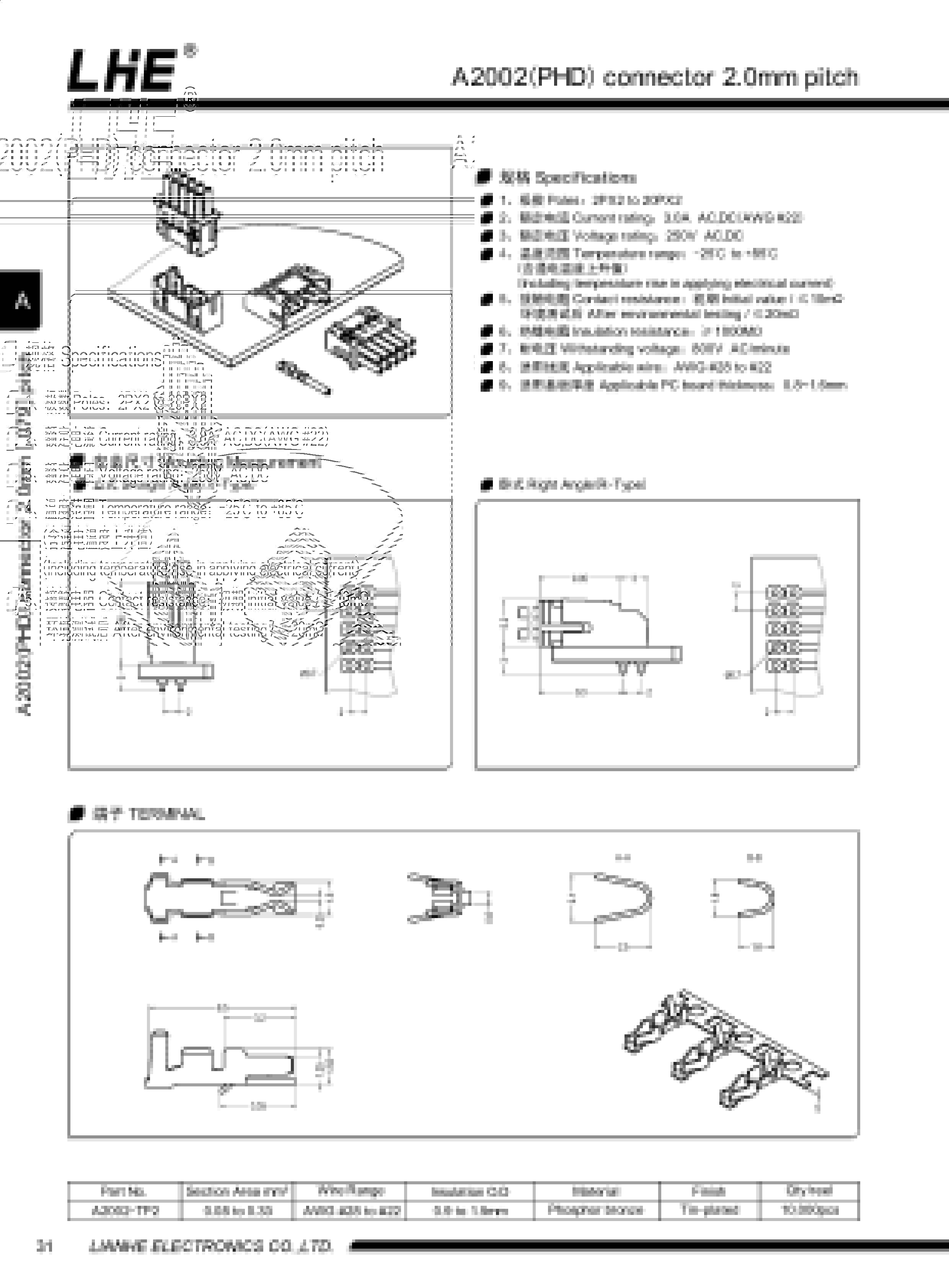 A2002(PHD)系列間距2.0mm, 可替代JST-PHDR PHDSS系列,印刷線路板用連接器/壓著,接插型,廣泛用于小型家用電路的線路板上,該系列采用雙排構造,低型面設計,滿足內部配線高密度封裝化的需求。