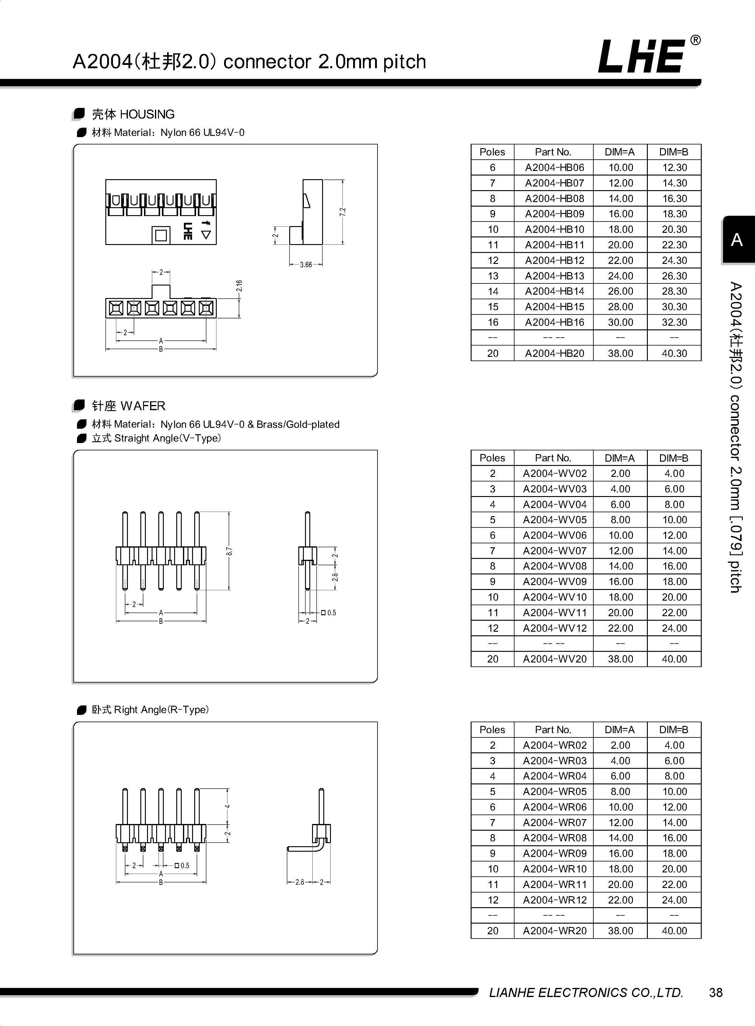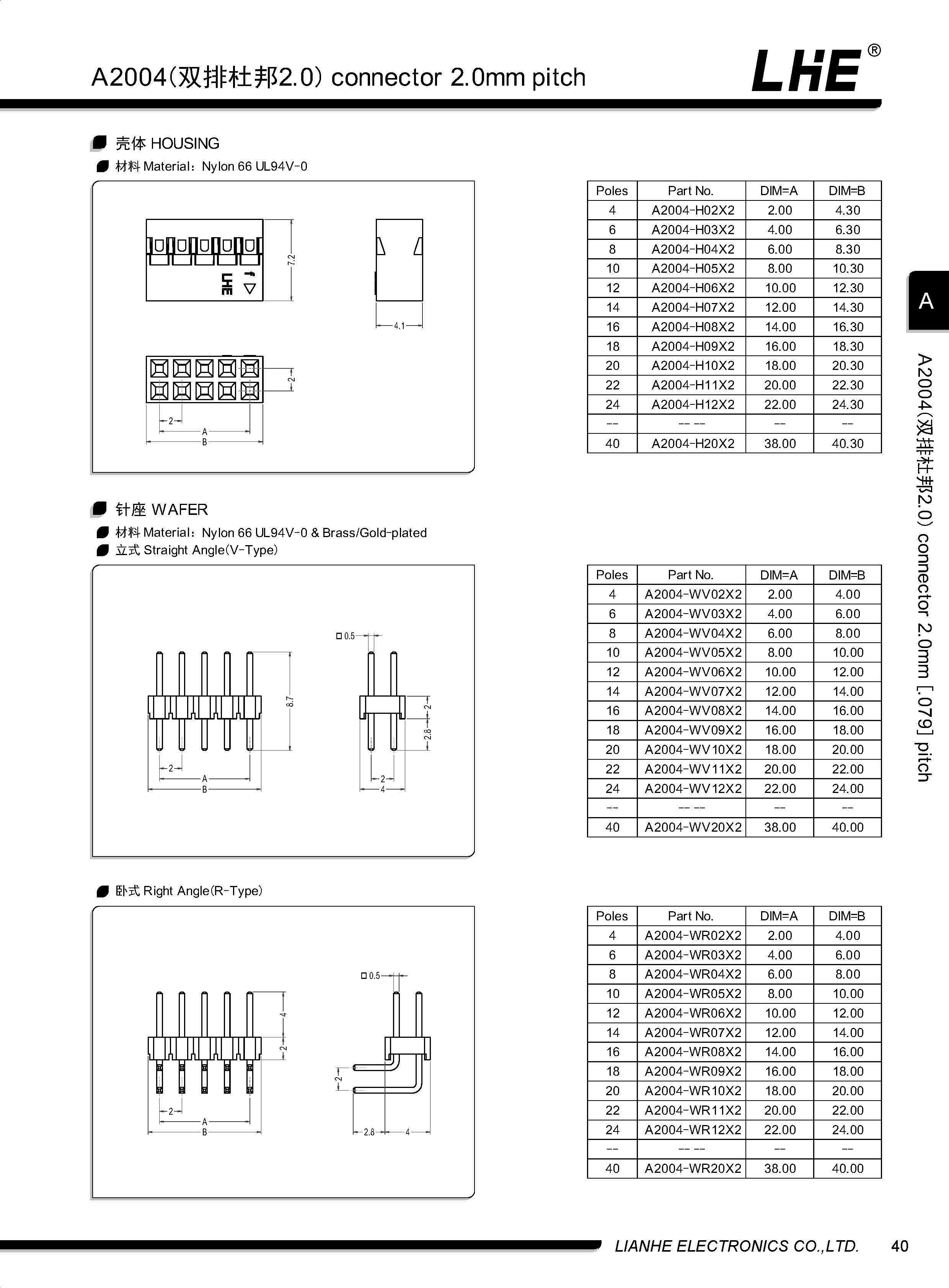 A2004(杜邦2.0)系列間距2.0mm,可替代杜邦2.0系列,包含單排/雙排,膠殼 連接器 針座 端子,杜邦系列被大批量使用于電腦電路板,其變種豐富,設計出各種不同外形的產品,適用于各種要求,我司生產為通用款。