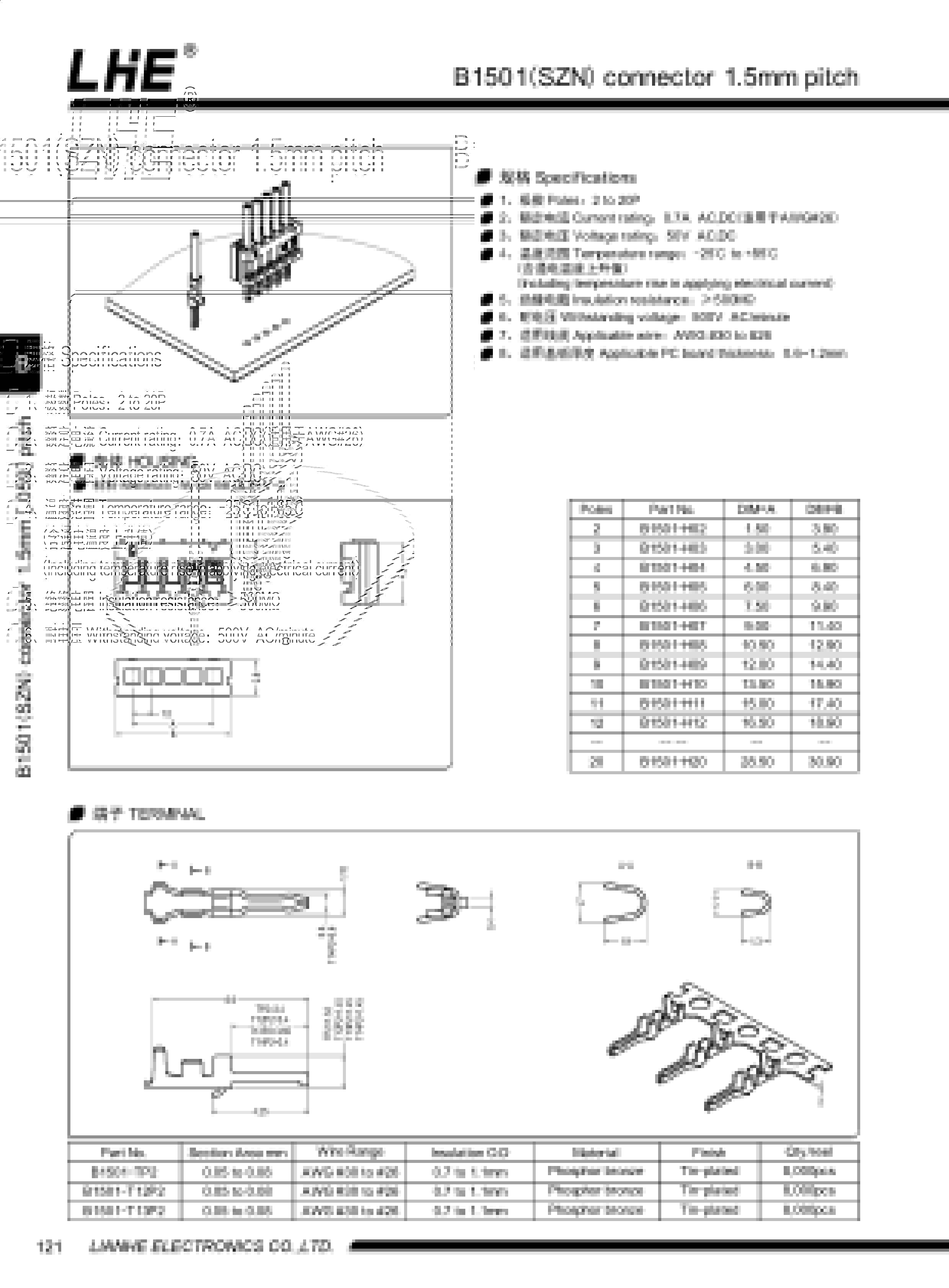 B1501(SZN)系列間距1.5mm,包含膠殼 連接器 端子,與SAN SCN 系列類似,均為立式直插型產(chǎn)品,廢棄了針座這一環(huán)節(jié),從針部直接焊板上,操作效率更高,因為比普通直插型端子,多一個絕緣外殼,所以更安全,更牢固。