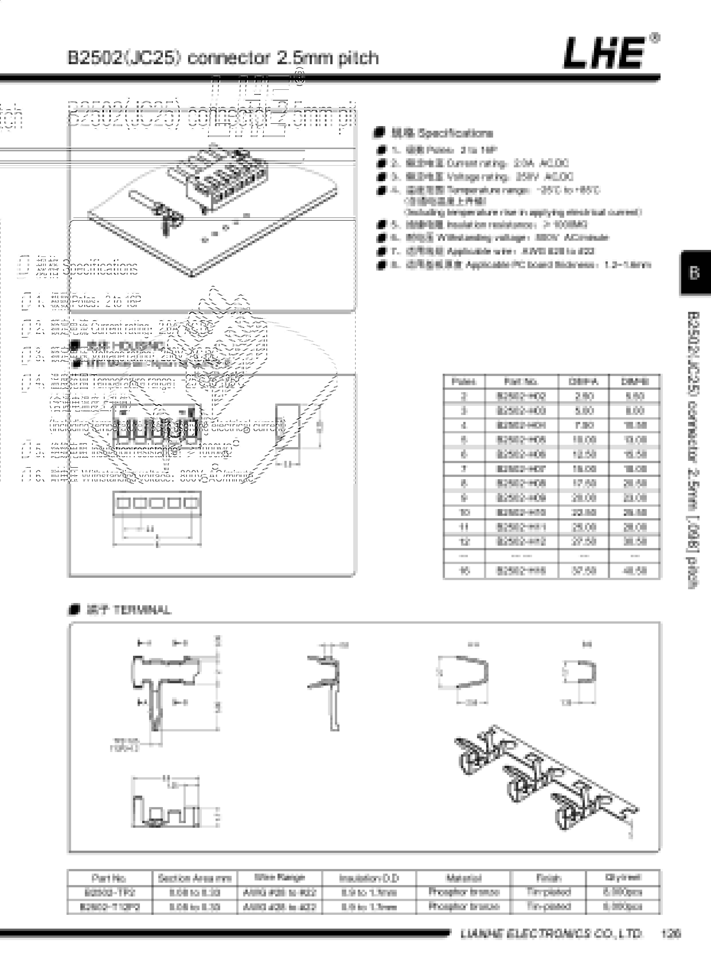 B2502(JC25)系列間距2.5mm,包含膠殼 連接器 端子,與JC20 JC15 系列類似,均為臥式直插型產(chǎn)品,廢棄了針座這一環(huán)節(jié),從針部直接焊板上,操作效率更高,因為比普通直插型端子,多一個絕緣外殼,所以更安全,更牢固。