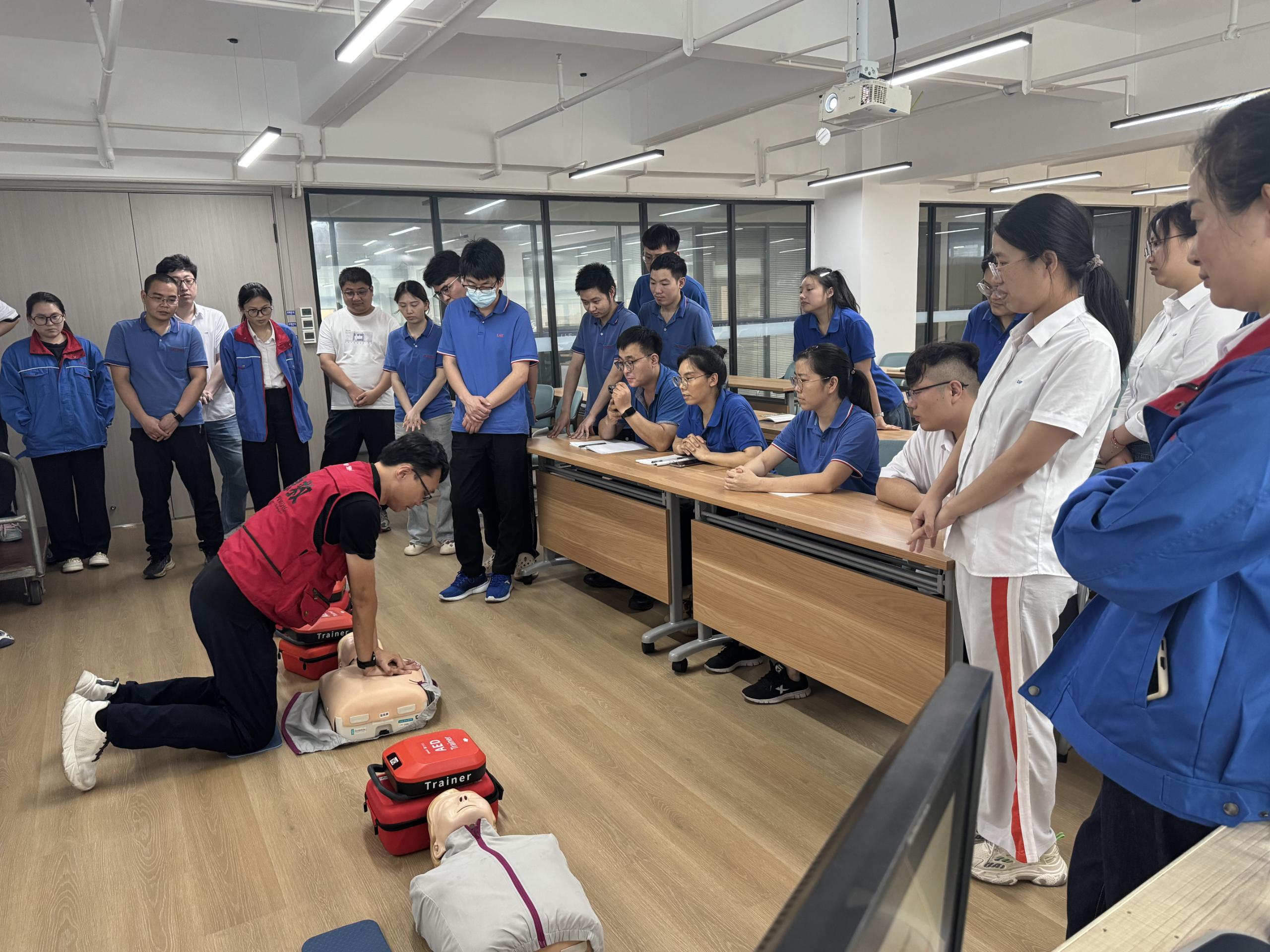 ???從手忙腳亂到動作標準,同事們輪流在模擬人上練習,導師一對一糾正細節:“手臂要伸直”、“按壓后讓胸廓充分回彈”。通過模擬真實場景的反復訓練,使參與者們更能熟練掌握急救流程,消除對AED設備的陌生感。